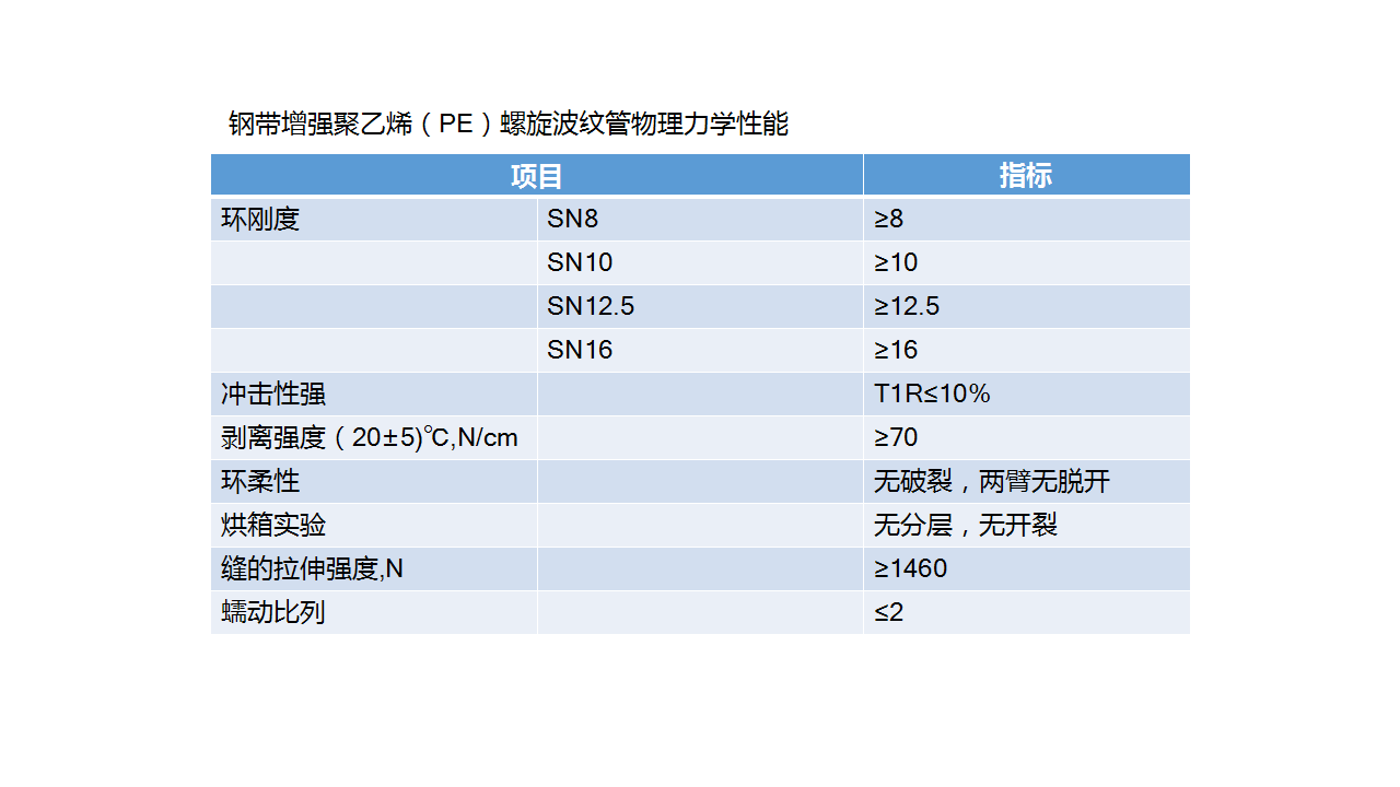 12.全然确实的环刚度:由于钢和塑料两种材质的弹性模量比大于200,重量比大于7.85,与纯塑料管相比之下,钢带加固可以使管子易于制造(特别是大直径的管道)具有安全准确的环刚度和较高的刚度重量比